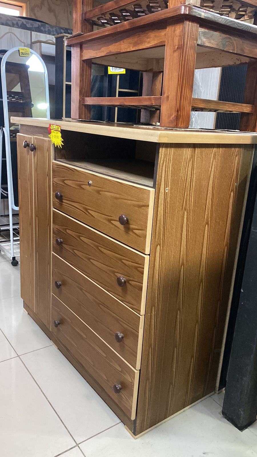Cómoda closet color café claro, con 4 cajones y dos puertas laterales.